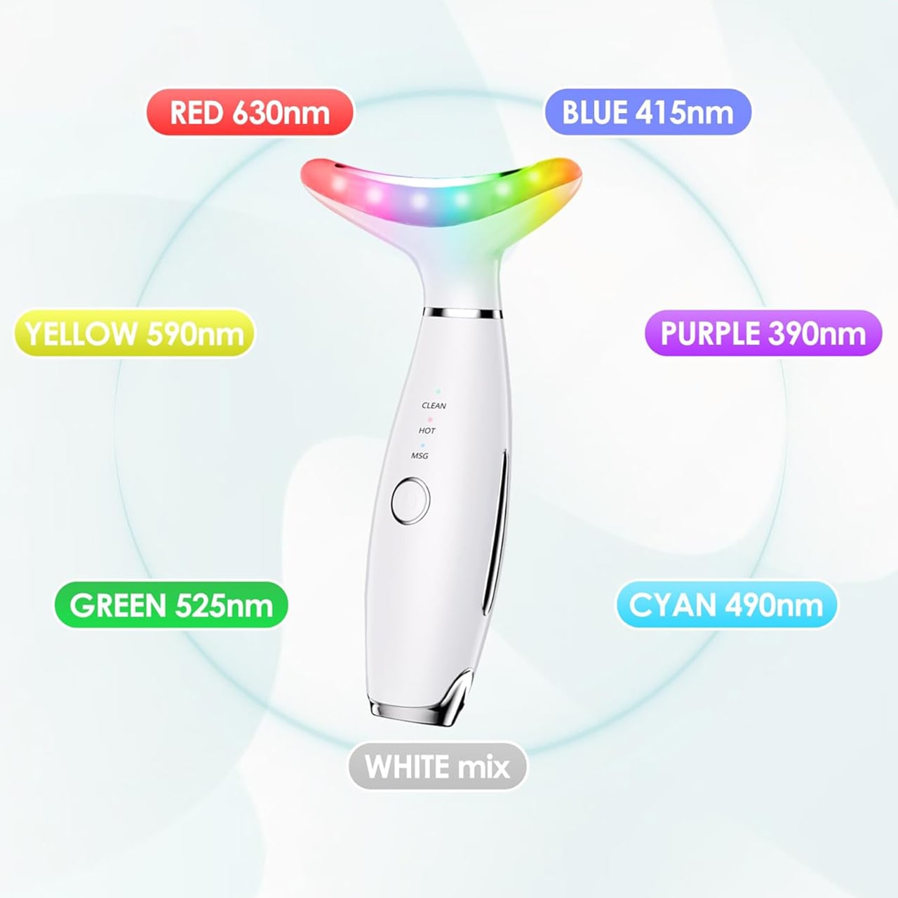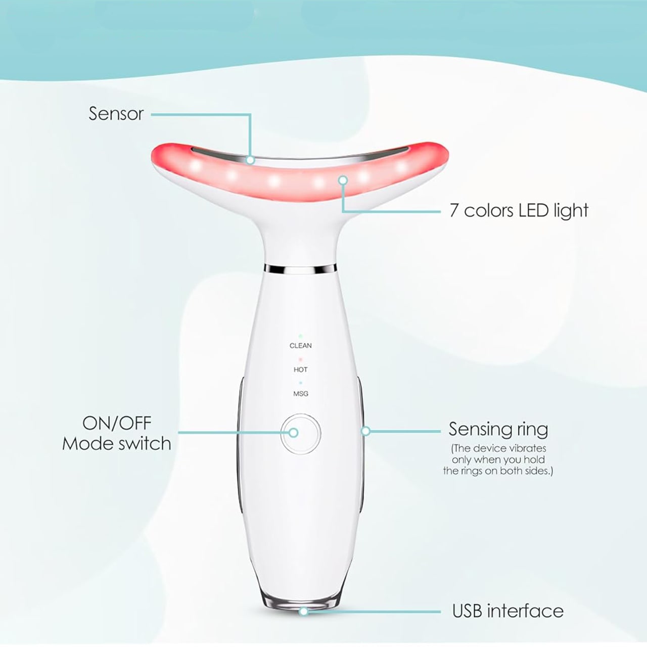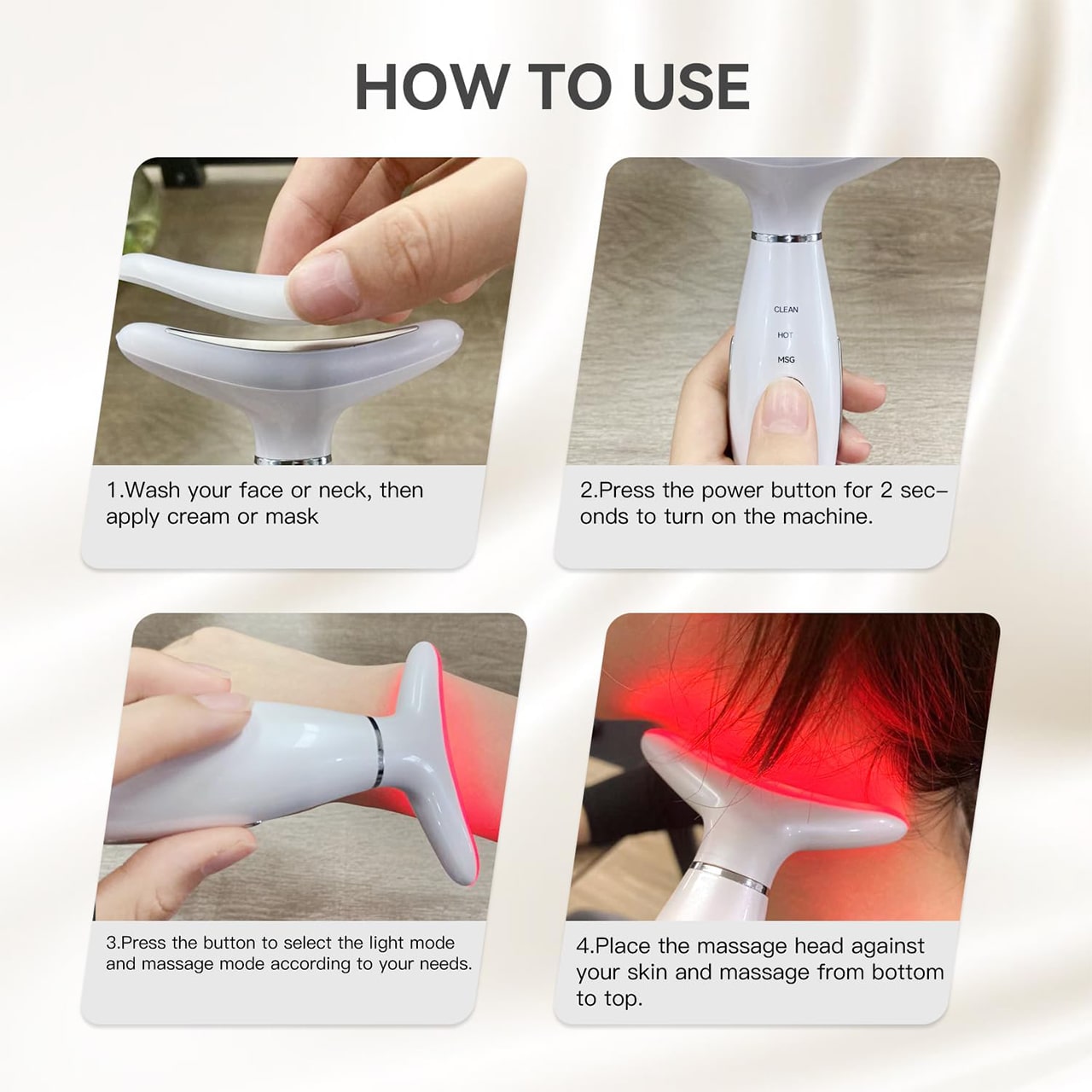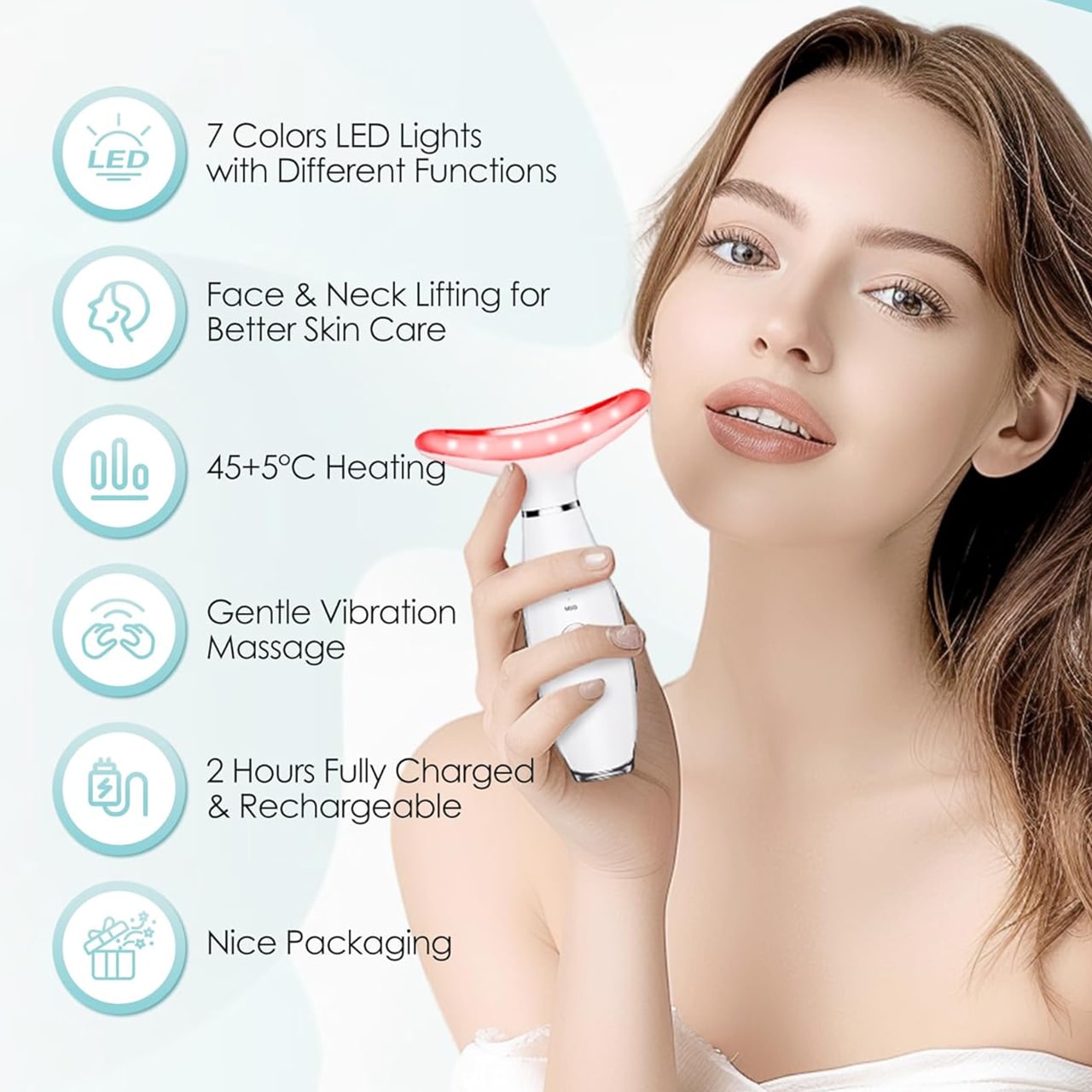 Na masáž krku, obličeje a čelisti a pro zlepšení vzhledu pleti. Po umytí obličeje rovnoměrně naneste své oblíbené produkty péče o pleť. Poté stiskněte a podržte tlačítko napájení po dobu 2 sekund, abyste zařízení zapnuli. Použijte tlačítko pro výběr požadovaného režimu světla a masážního režimu podle vašich potřeb. Umístěte masážní hlavu na pleť a jemně masírujte odspodu nahoru pro optimální výsledky.
